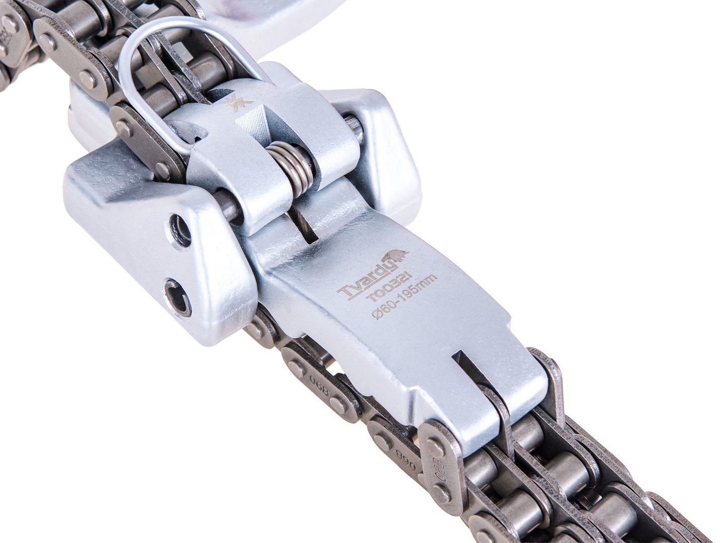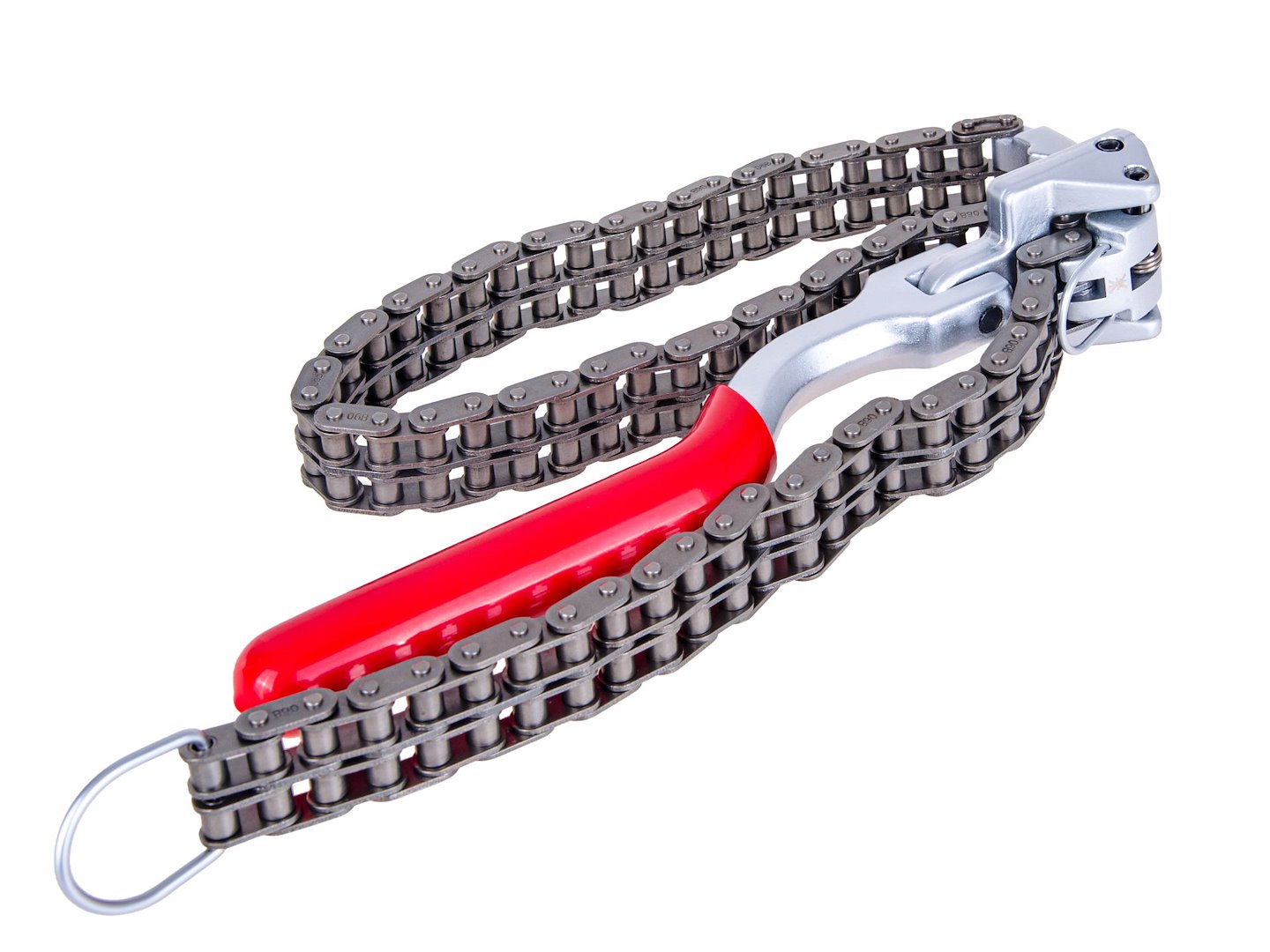 Řetězový klíč určený pro odšroubování olejových filtrů o průměru 60 až 195 mm, vybavený vysoce pevným ocelovým řetězem a hlavou otočnou o 180°.