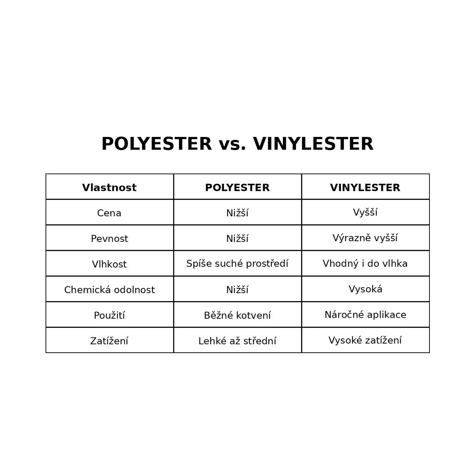 Chemická kotva VINYLESTER je určena pro pevné kotvení závitových tyčí, armatur a kovových prvků do betonu, zdiva či kamene. Dvousložková malta bez styrenu nabízí vysokou mechanickou pevnost bez rozpěrných sil, což umožňuje použití i v okrajových oblastech materiálu. Vhodná také do dutých materiálů při použití sítka. Reaguje i v uzavřených prostorech. Pro opakované použití je nutný nový směšovač. Nabízí výrazně vyšší pevnost, dlouhodobou spolehlivost a lepší odolnost vůči vlhkosti i chemickému zatížení než polyester, díky čemuž je ideální pro náročné aplikace, vysoké zatížení a kotvení v betonu i problematických nebo vlhkých podkladech.