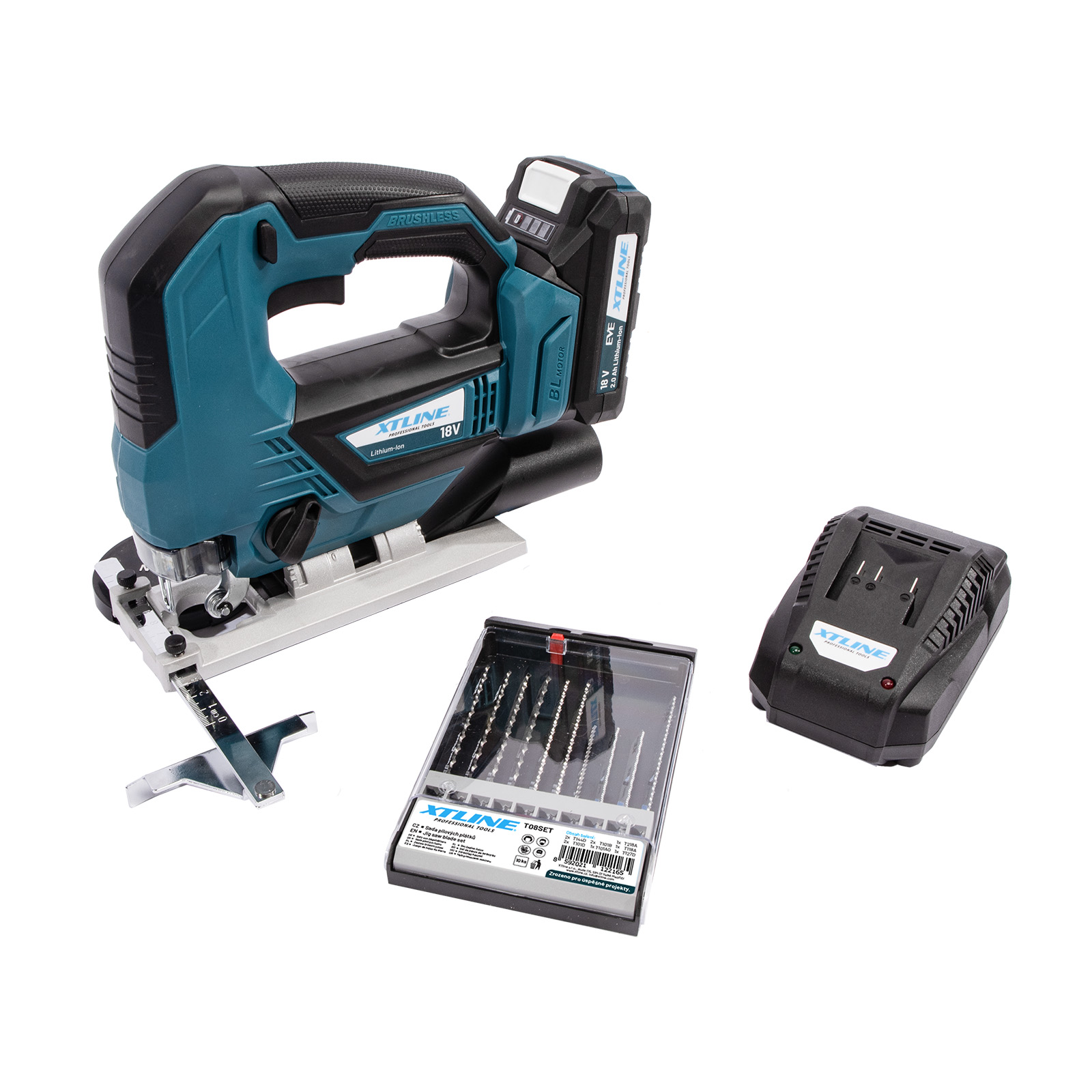XTLINE Aku přímočará pila bezuhlíková 18 V + baterie 2.0 Ah + nabíječka 2.4 A + pilové plátky + box