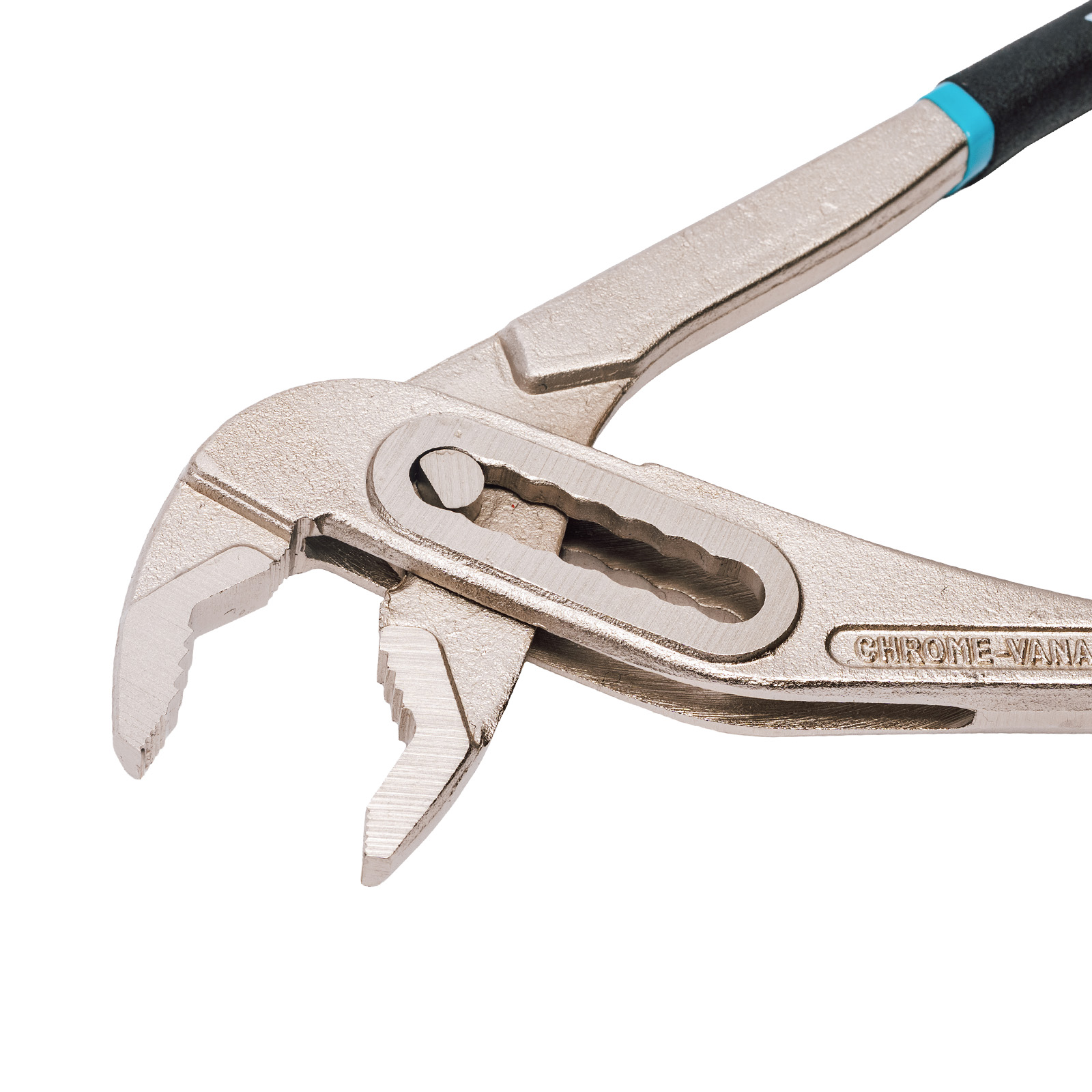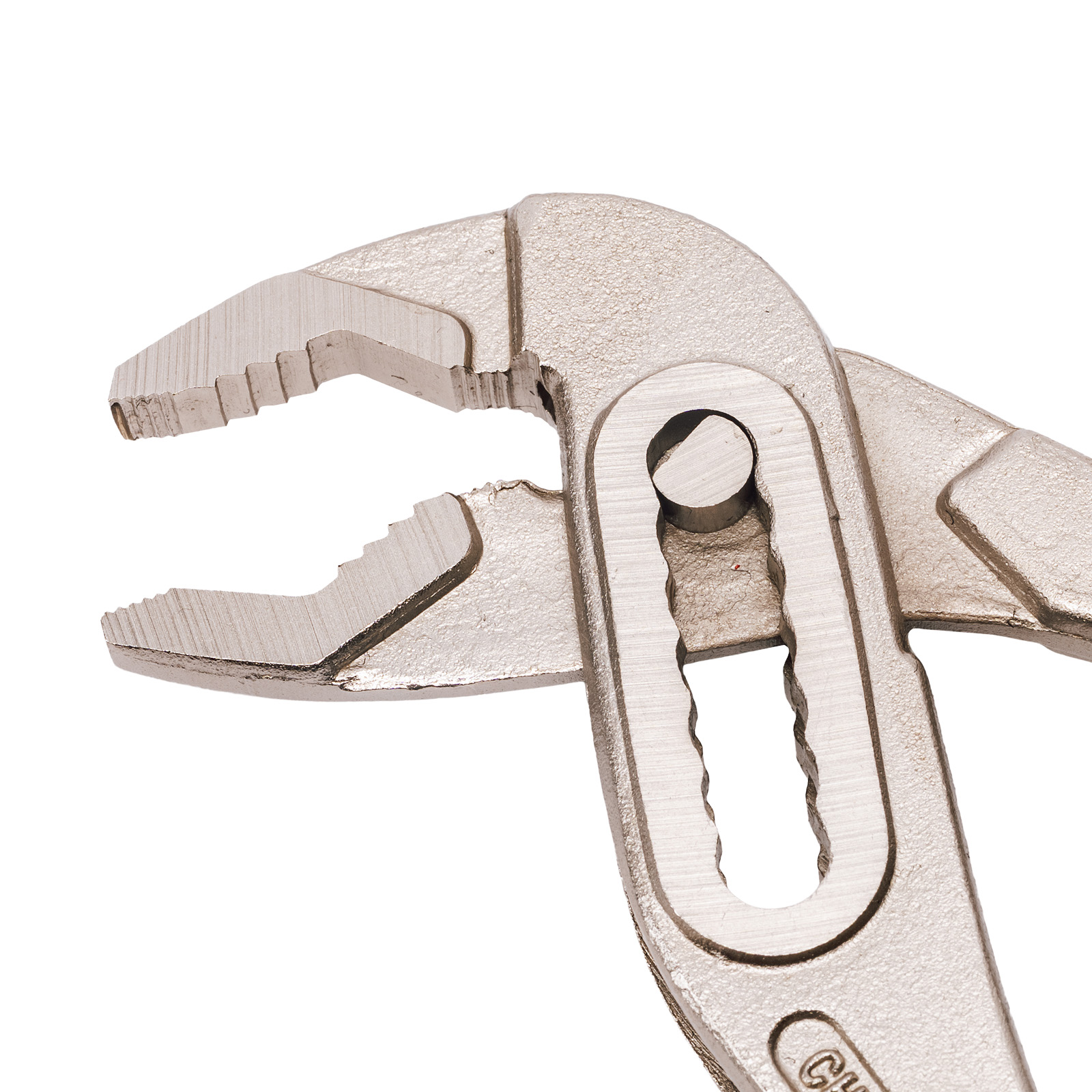 SIKO kleště z řady XTLINE. Konstrukce čelistí snižuje prokluz sevřeného materiálu a úsilí nutné k práci. Rukojeti vyrobené z kalené CrV oceli jsou dvouvrstvě potaženy a pogumovány. Mechanismus posuvu a nastavení rozpětí čelistí pomocí průchozího čepu kloubu.