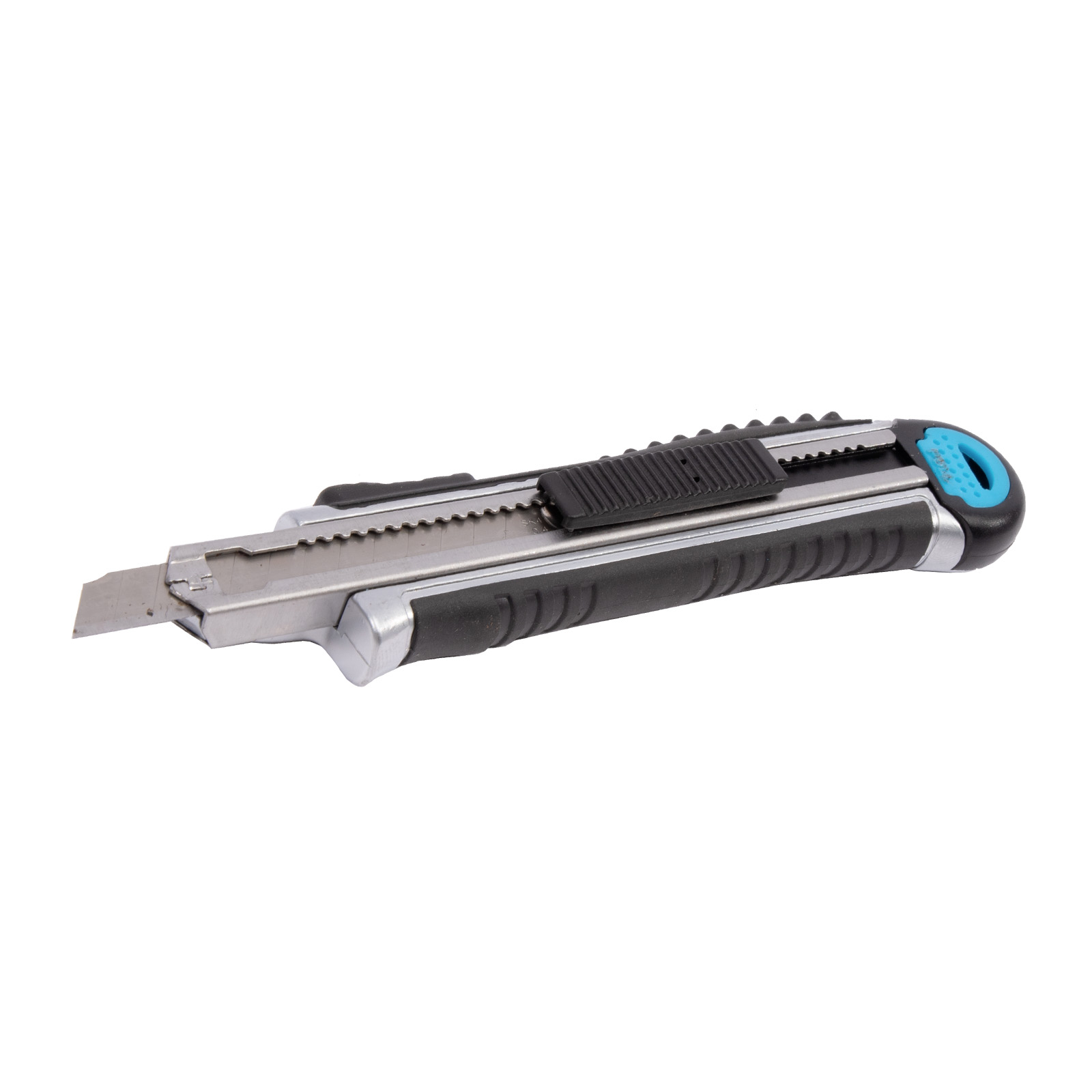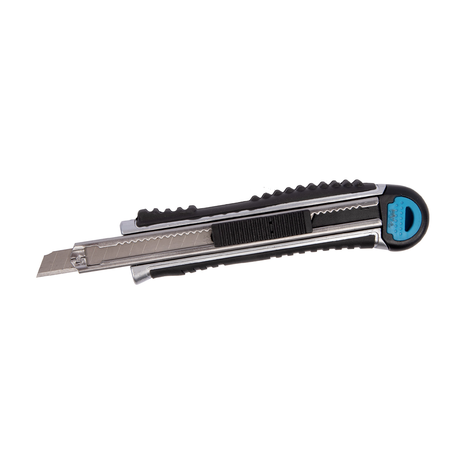 Celokovový ulamovací nůž s kovovou vodící lištou a pryžovým pláštěm. Ocelové vodítko čepele se vždy automaticky uzamkne proti pohybu a umožňuje rychlou výměnu náhradní čepele přímo ze zásobníku. Pogumovaná rukojeť s drážkami proti prokluzu. Vysouvač slouží jako zámek a rychlé výměně břitu. Vysouvací zásobník s 5 náhradními čepelemi.