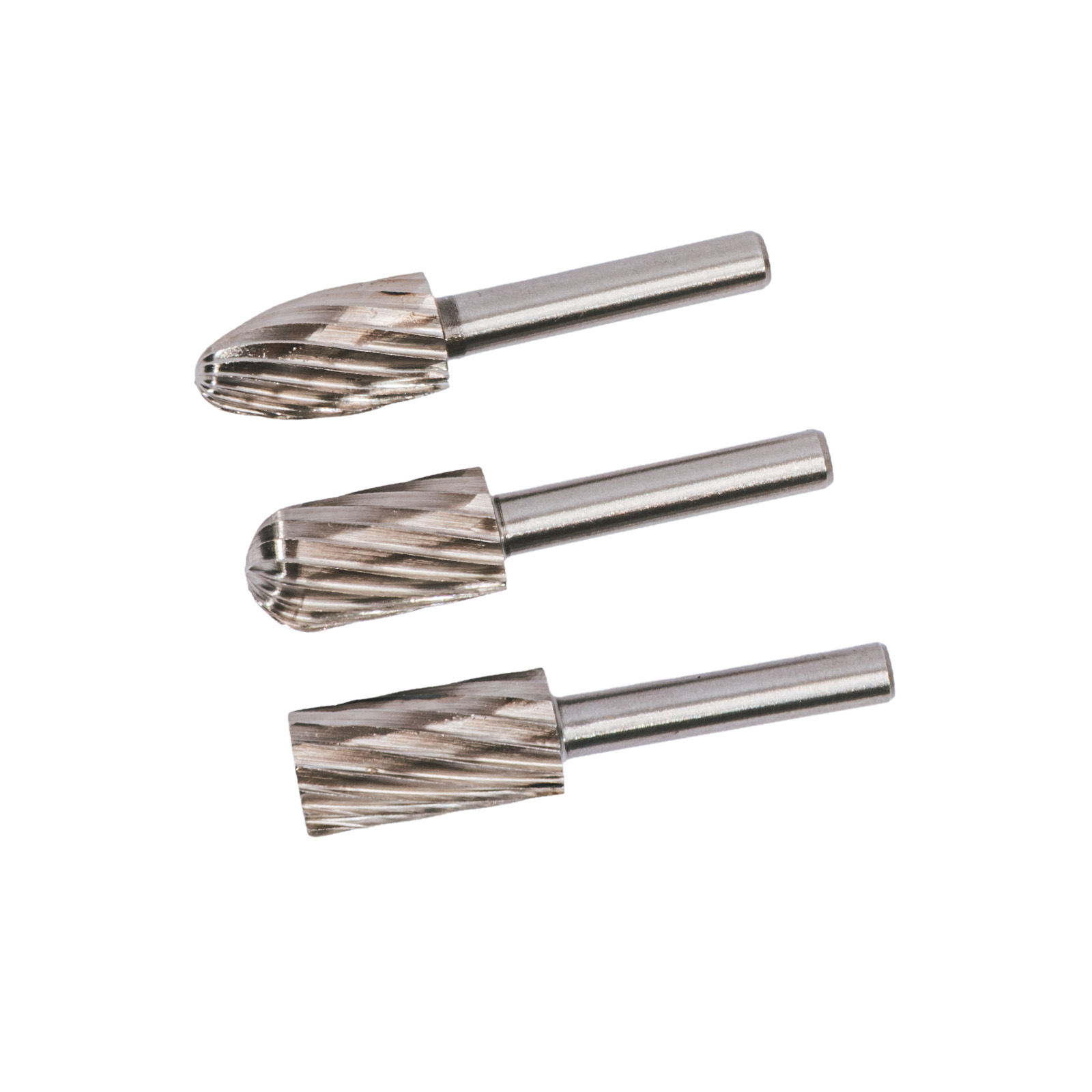 Třídílná sada kolíkových rotačních rašplí vhodných pro opracování dřeva, plastů nebo měkčích kovů. Upínání zajišťuje válcová stopka o průměru 1/4“ (6,35 mm).