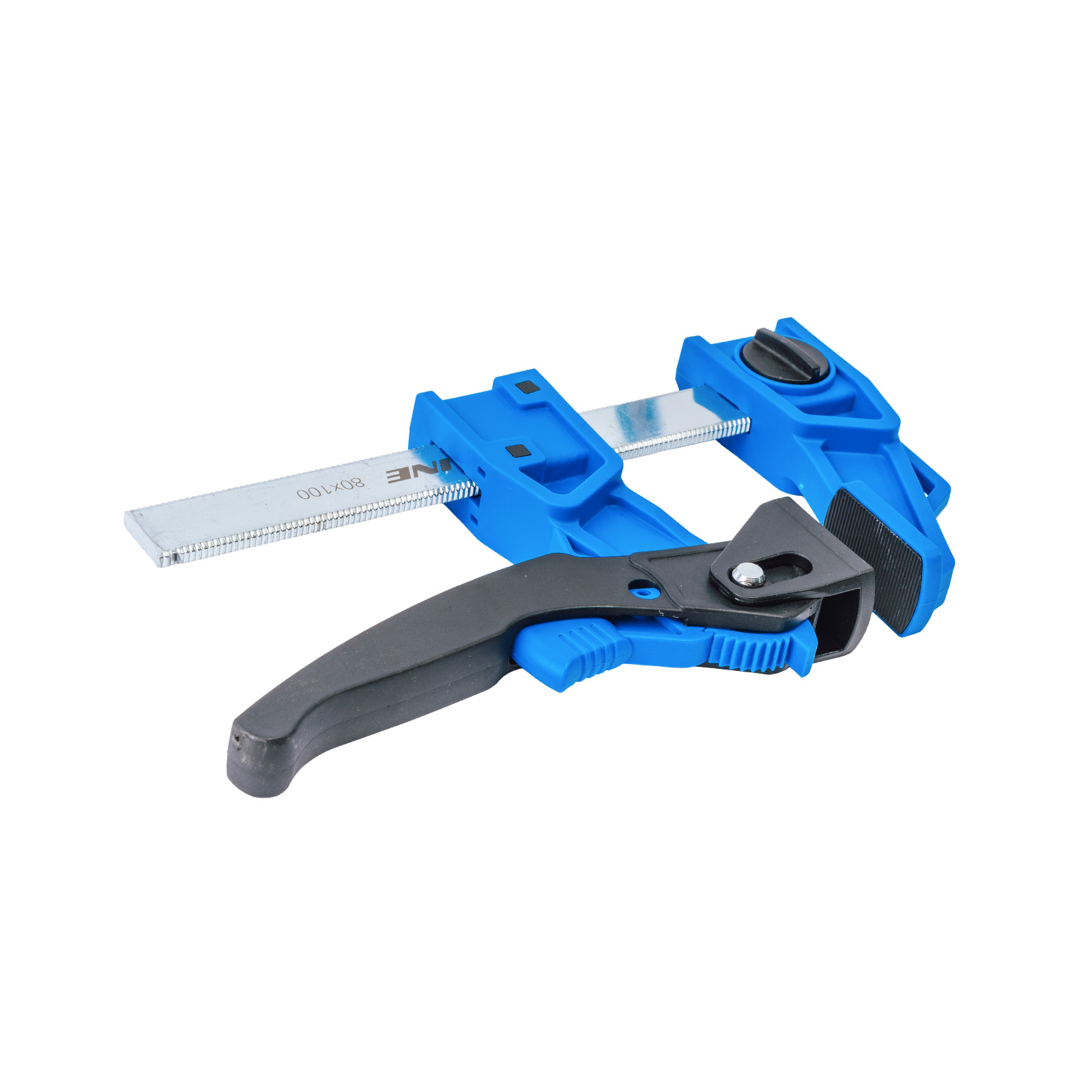 Rychloupínací páková svěrka umožňuje snadné a rychlé upnutí materiálu jednou rukou. Díky ergonomické páce je manipulace pohodlná a bez námahy. Silná upínací síla (max.1200 N) a plastové čelisti s ochrannými krytkami chrání povrch materiálu před poškozením. Svěrku lze přestavět ze stahovací na rozpínací. Sedlo svěrky je nastavitelné v rozmezí 120°.